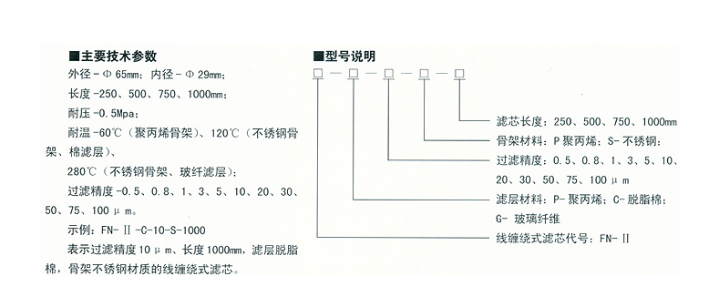 FN—III-5-1000-B表示:過濾精度為5 u m,長度1000mm,端蓋為B型的聚丙烯折疊式濾芯。