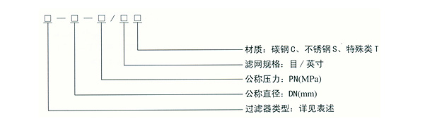本公司的管道過濾器,主要有:1、Y型過濾器 2、T型過濾器 3、籃式過濾器 4、臨時過濾器 5、氣體過濾器。其型號標注如下: